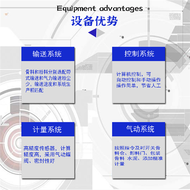 主要由提升輸送系統(tǒng)、計量配料系統(tǒng)、混合系統(tǒng)、儲料系統(tǒng)、包裝系統(tǒng)、除塵系統(tǒng)、控制系統(tǒng)、鋼架平臺等組成。